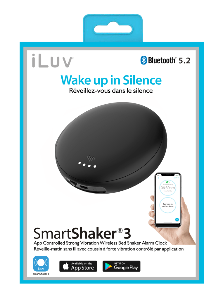 A wireless, heavy-duty haptic shaker alarm designed for heavy sleepers, deaf and elderly users. Stay safer, independent, and connected with notification alerts from iOS and Android apps.